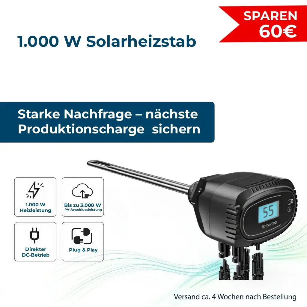 fothermo Solarheizstab mit 1.000 W Heizleistung. Stufenlose Leistungsregelung für eine effiziente Warmwassererzeugung. Einfache Inbetriebnahme und hohe Kostenersparnis.